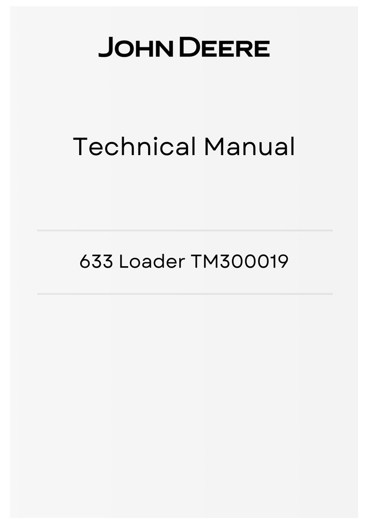 THIS COMPREHENSIVE TECHNICAL MANUAL FOR THE JOHN DEERE 633 LOADER (TM300019) PROVIDES DETAILED GUIDANCE ON MAINTENANCE, TROUBLESHOOTING, AND REPAIR PROCEDURES. DESIGNED FOR PROFESSIONALS, IT OFFERS PRECISE DIAGRAMS AND SPECIFICATIONS TO ENSURE ACCURATE SERVICING AND OPTIMAL PERFORMANCE OF YOUR LOADER. DELIVERED IN PDF FORMAT FOR EASY ACCESS AND REFERENCE, THIS MANUAL IS AN ESSENTIAL RESOURCE FOR TECHNICIANS SEEKING EXPERT-LEVEL SUPPORT.