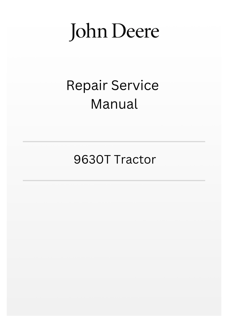 The TM2268 is the comprehensive factory repair and service manual for John Deere 9630T tractors. This detailed technical guide covers complete maintenance procedures, troubleshooting protocols, component specifications, and step-by-step repair instructions for all major systems. Designed for technicians and operators, it provides the exact information needed for efficient equipment servicing and restoration. Essential reference material for anyone responsible for 9630T tractor upkeep and repairs.
